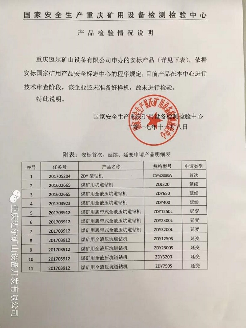 2017年12月底,我司11個安標產品進行了申報,2018年元月接受了重慶煤科院檢測中心專業人員的現場抽樣檢測。